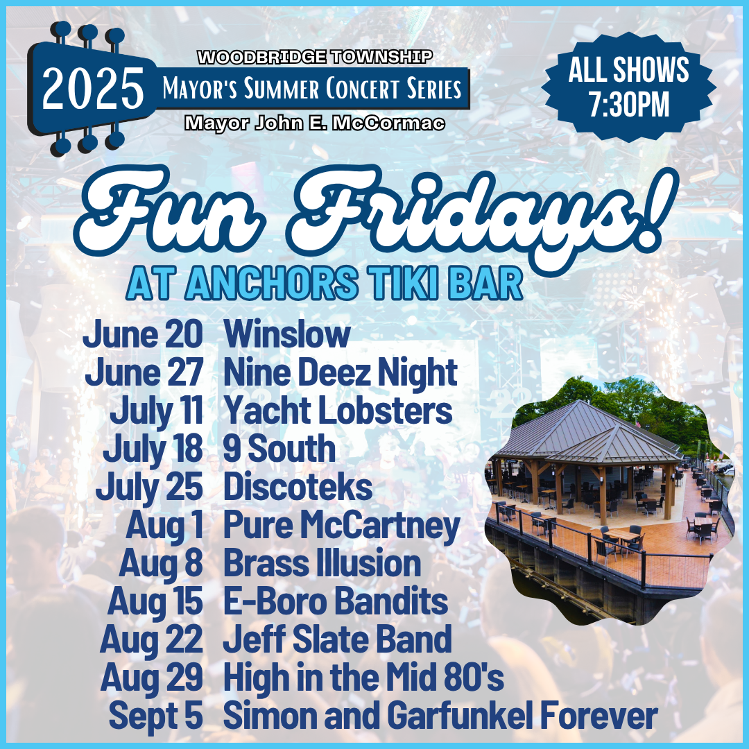 Anchors Tiki Bar is thrilled to host the Mayor’s Summer Concert Series Fun Fridays! Please remember outside food and drink will NOT be permitted. Thanks for your cooperation and understanding! Here’s to a summer of Fun Friday nights together!